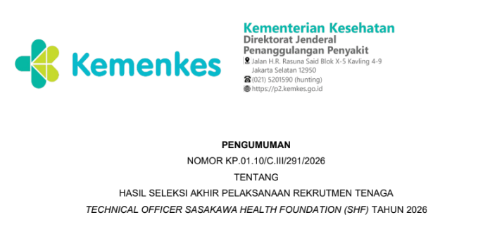 PENGUMUMAN HASIL SELEKSI AKHIR PELAKSANAAN REKRUTMEN TENAGA TECHNICAL OFFICER SASAKAWA HEALTH FOUNDATION (SHF) TAHUN 2026