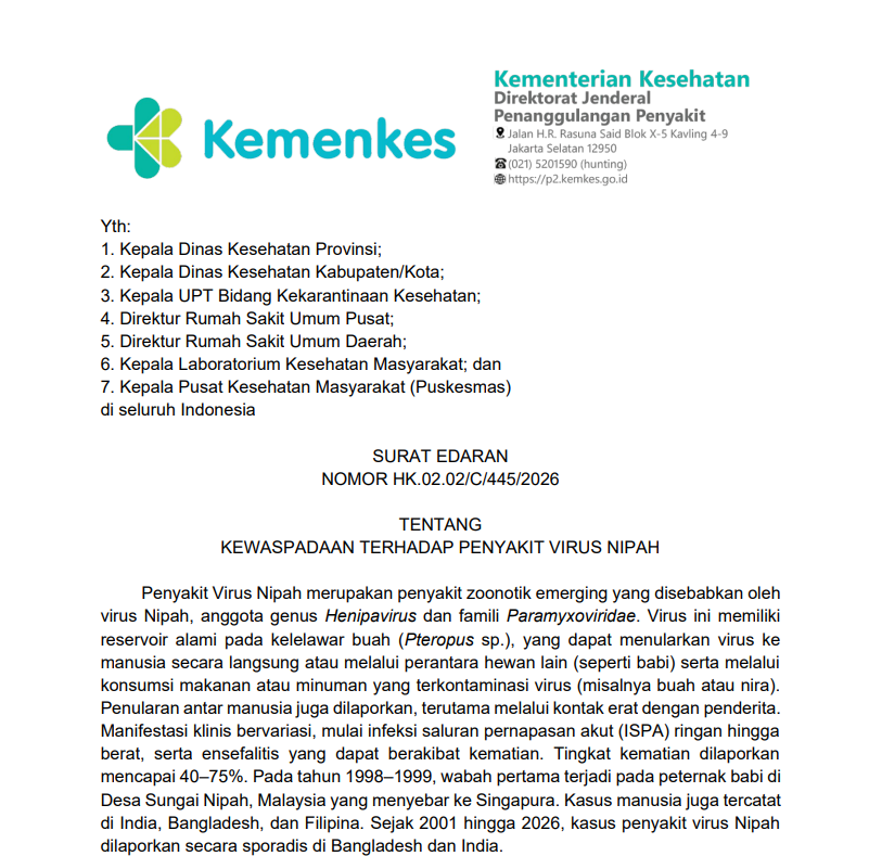 Circular Letter: Alertness Against Nipah Virus Disease