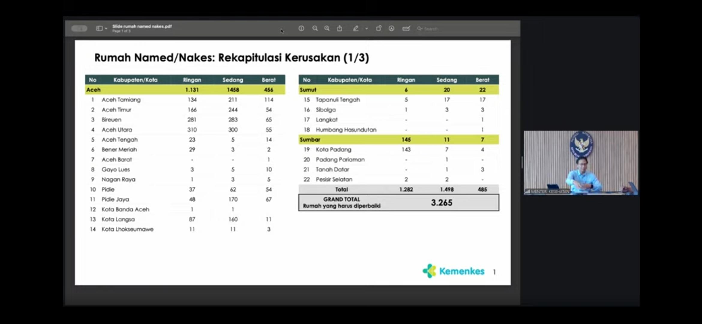 “Data rumah tenaga kesehatan dan tenaga medis terdampak dengan rincian di Aceh sebanyak 3.050 unit, di Sumatra Utara 48 unit, dan di Sumatra Barat 167 unit, dengan total 3.265 unit rumah,” kata Jarwansyah.