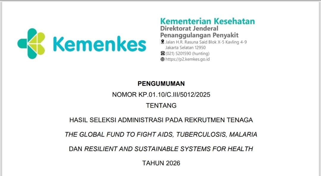 Kementerian Kesehatan RI melalui Direktorat Jenderal Pencegahan dan Pengendalian Penyakit (P2P) resmi merilis daftar pelamar yang dinyatakan lulus seleksi administrasi untuk rekrutmen tenaga The Global Fund to Fight AIDS, Tuberculosis, Malaria dan Resilient and Sustainable Systems for Health (GF-ATMR) Tahun Anggaran 2026.