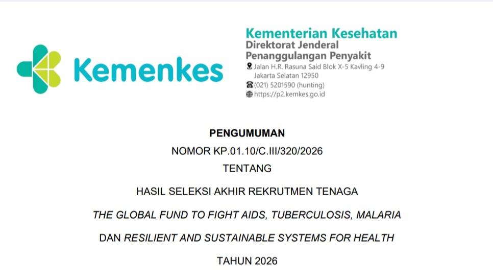 PENGUMUMAN HASIL SELEKSI AKHIR REKRUTMEN TENAGA THE GLOBAL FUND TO FIGHT AIDS, TUBERCULOSIS, MALARIA DAN RESILIENT AND SUSTAINABLE SYSTEMS FOR HEALTH TAHUN 2026
