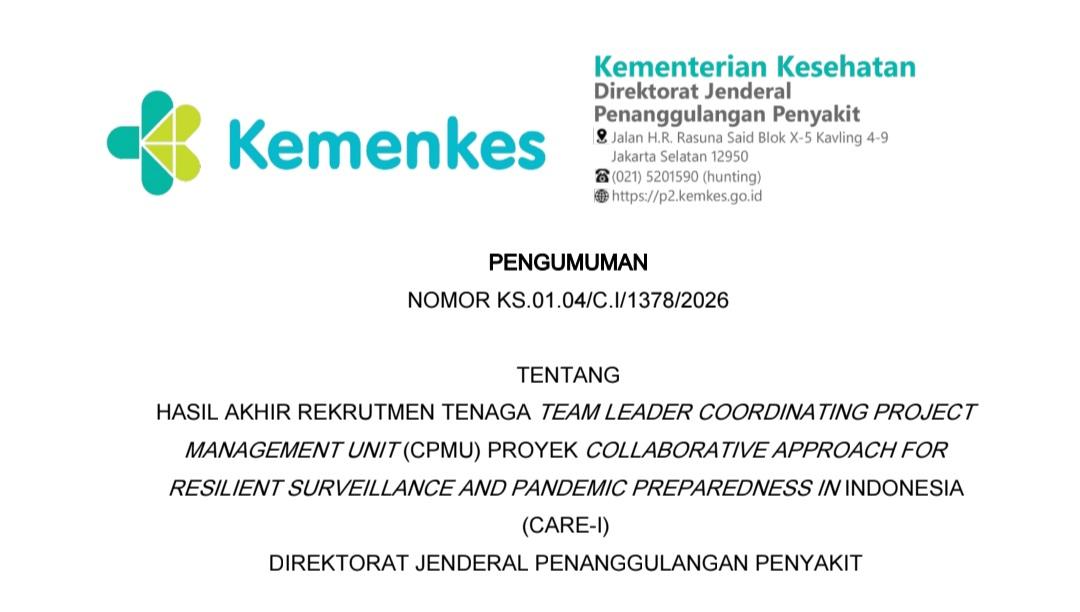 Pengumuman Hasil Akhir dapat dilihat melalui tautan: https://s.kemkes.go.id/HasilAkhirRekrutmenTeamLeaderCPMUCARE-I2026