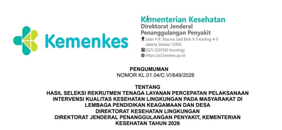 Pengumuman Hasil Seleksi Rekrutmen Tenaga Layanan Percepatan Pelaksanaan Intervensi Kualitas Kesehatan Lingkungan pada Masyarakat di Lembaga Pendidikan Keagamaan dan Desa Tahun 2026