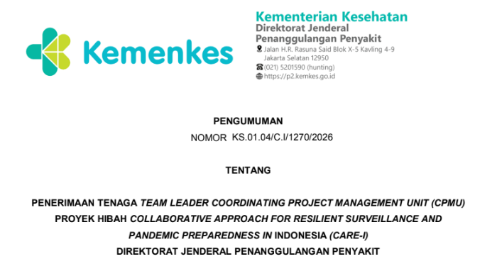 Pengumuman melalui tautan: s.kemkes.go.id/PenerimaanTenagaTeamLeaderCPMUHibahCARE-I2026